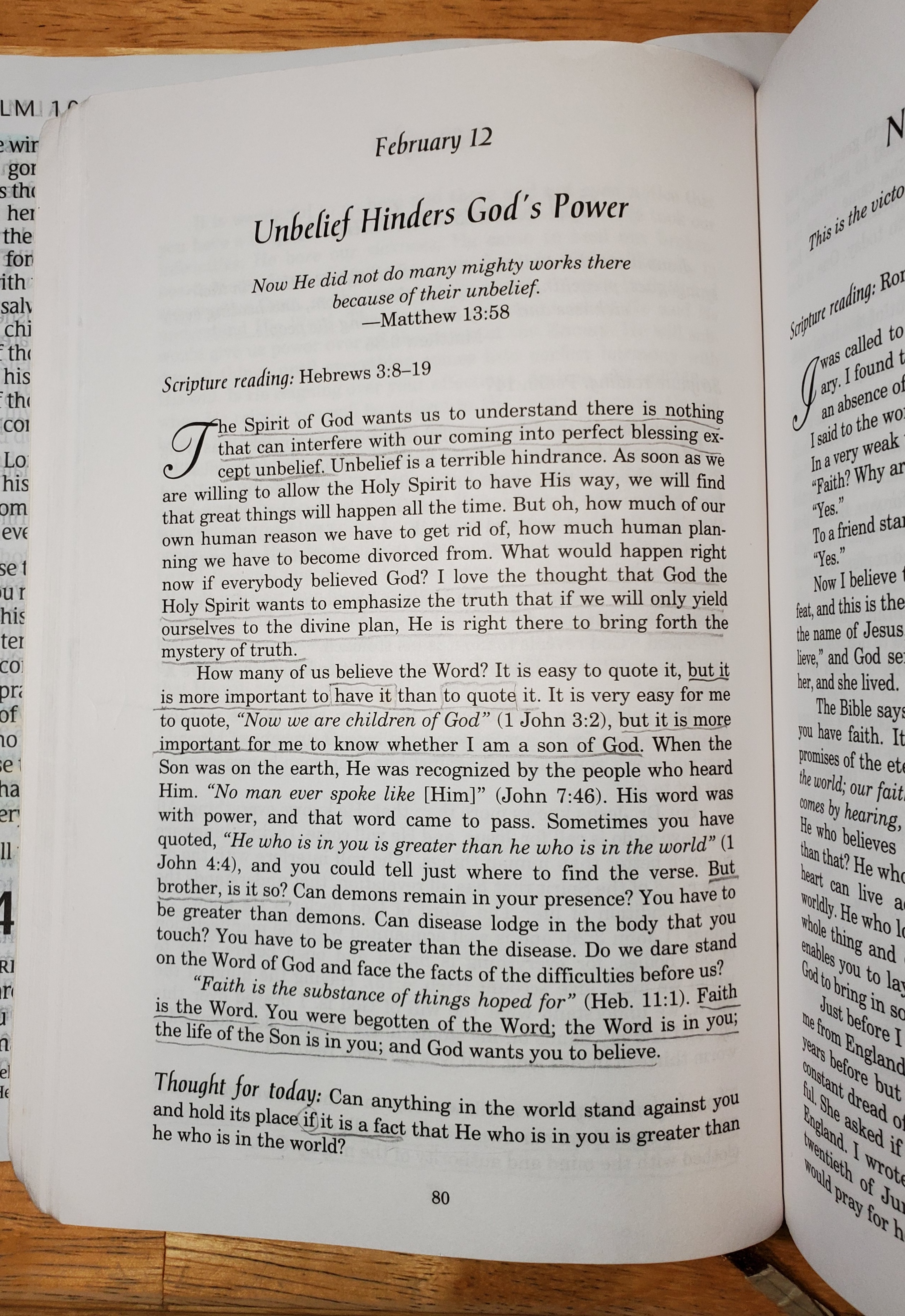 There is a great devotional from this book: Smith Wigglesworth Devotional put together by Whitaker House that deals with the subject of unbelief that is applicable to this study on belief and faith. (See page below). The first and last sentence from this devotional is what I wanted to highlight.
